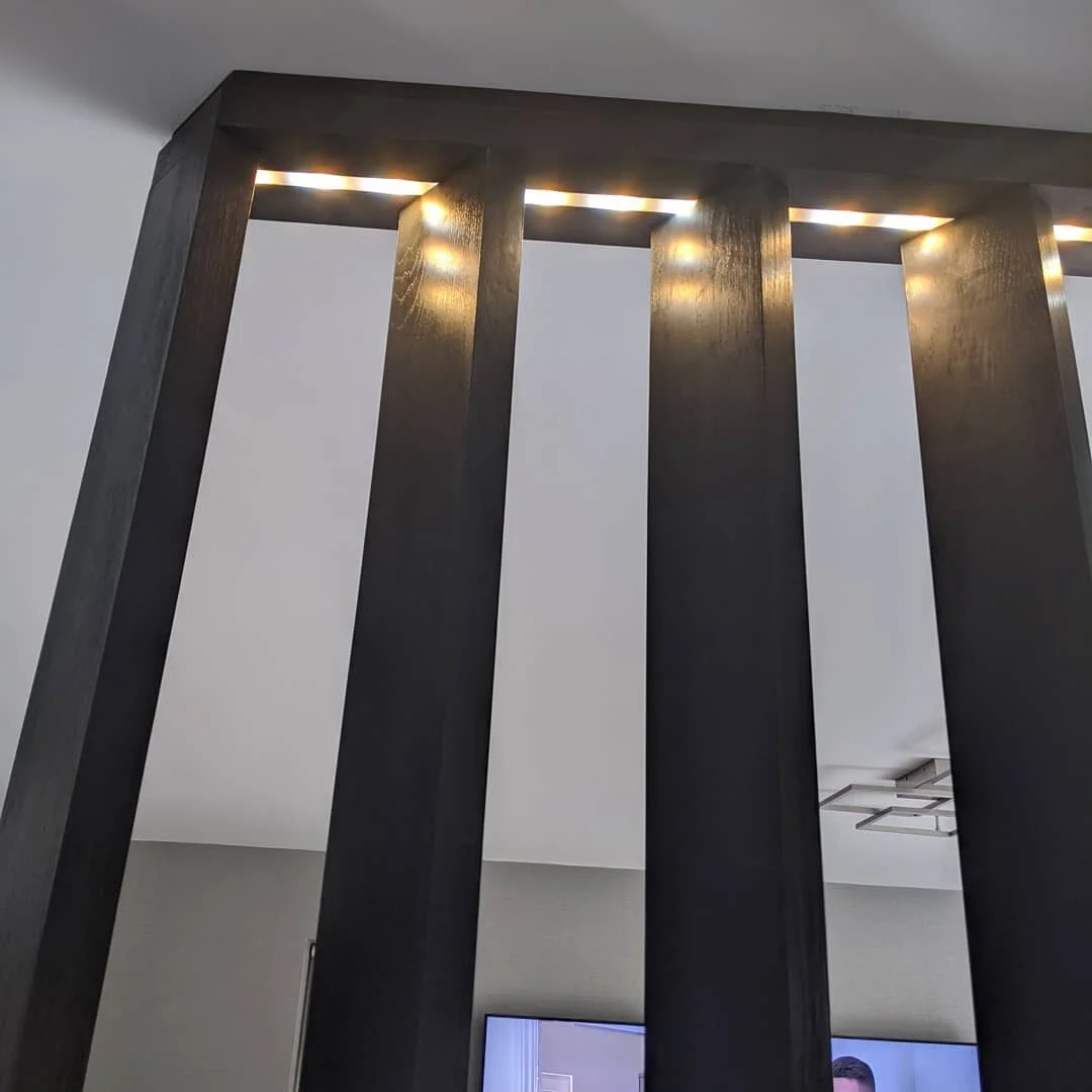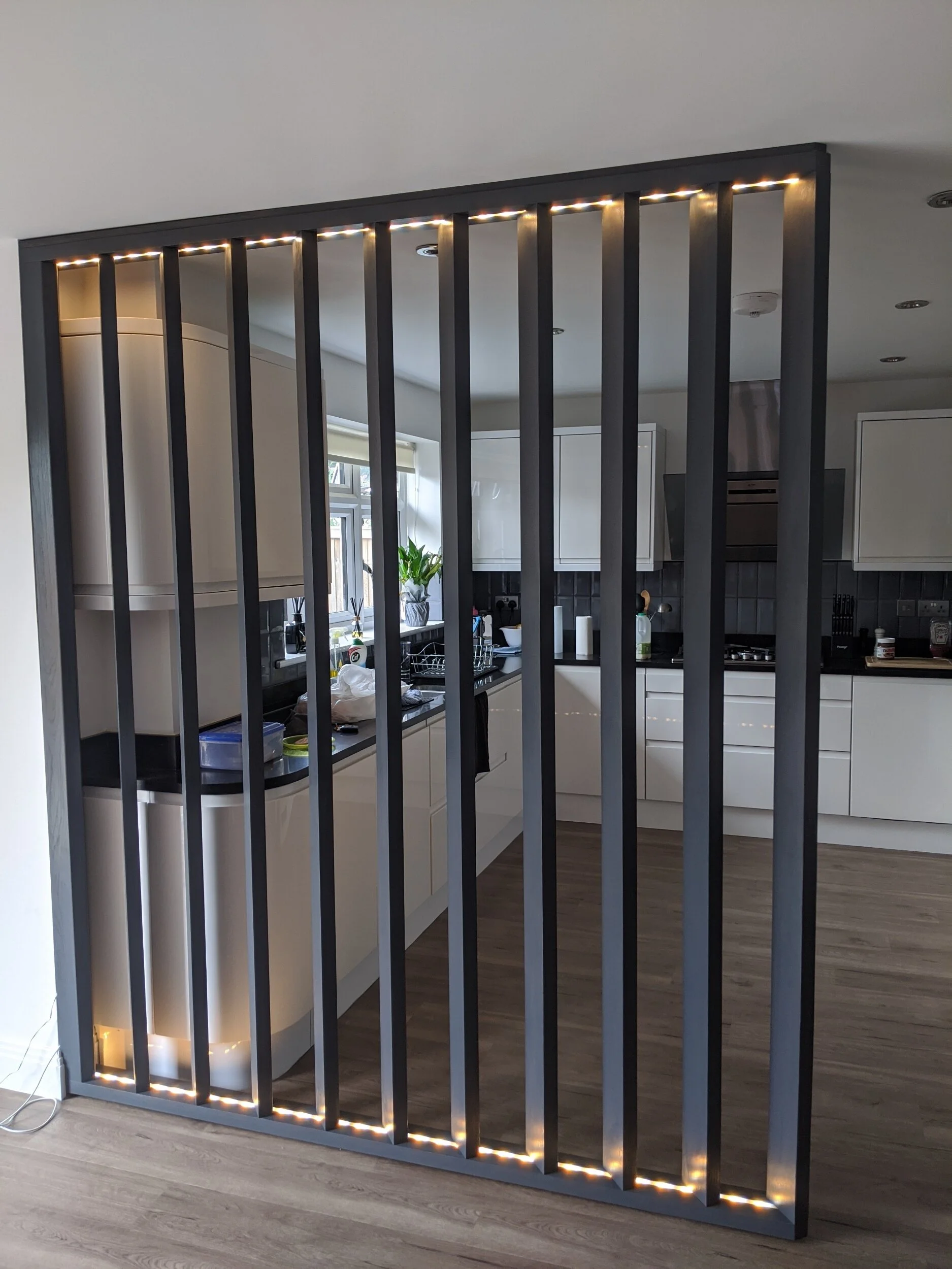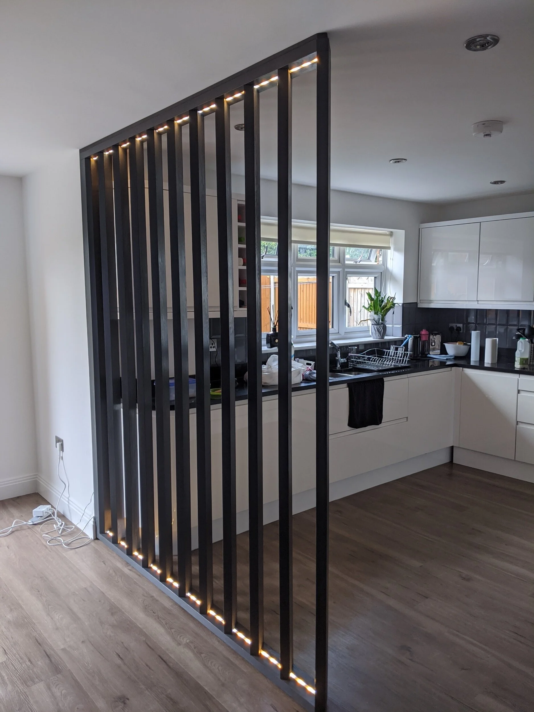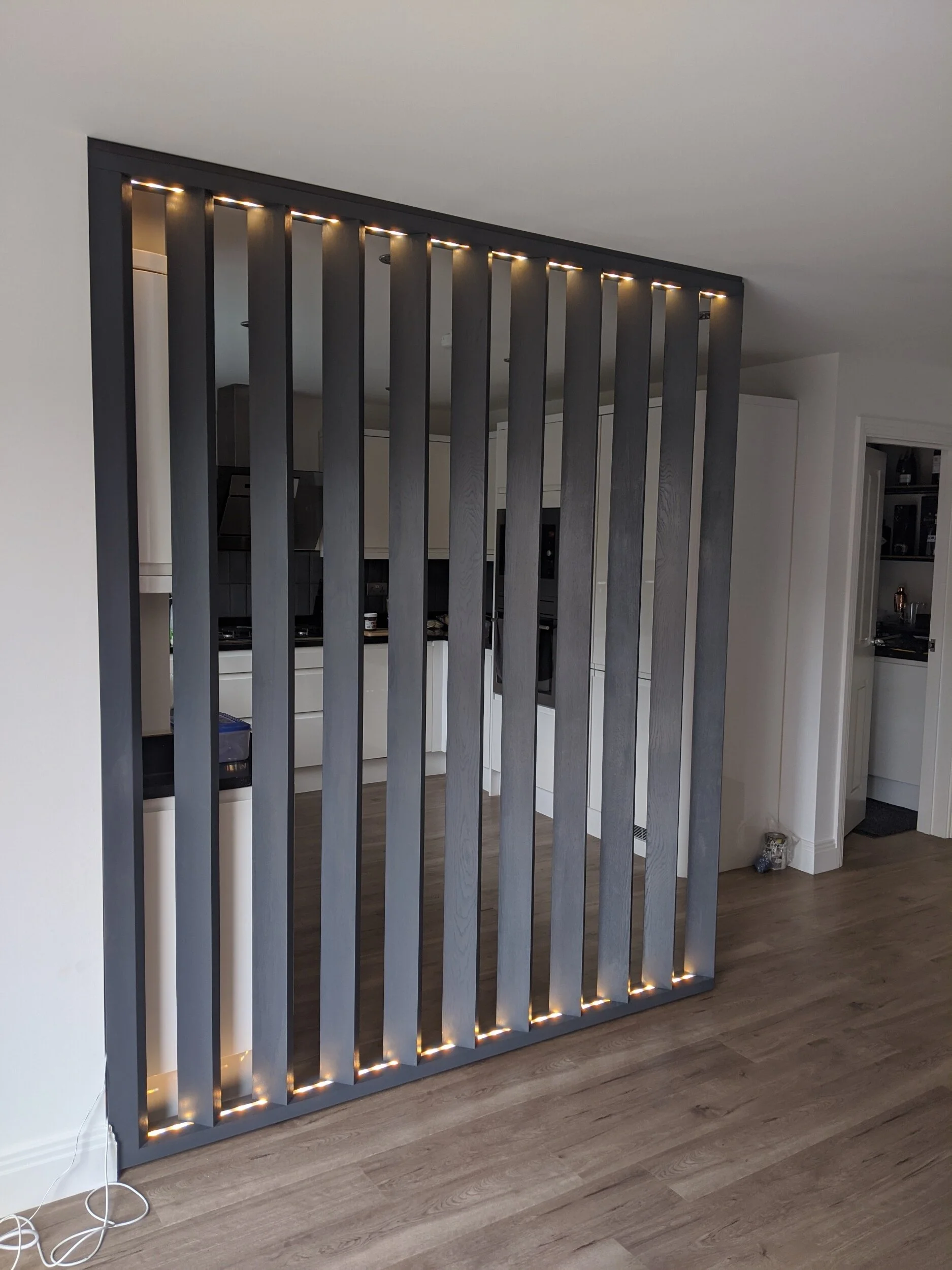 Dividing wall screen Bespoke oak veneer dividing wall screen with led lights finished in osmo graphite oil. Ben CordellAugust 26, 2020 Facebook0 Twitter Reddit Tumblr 0 Likes